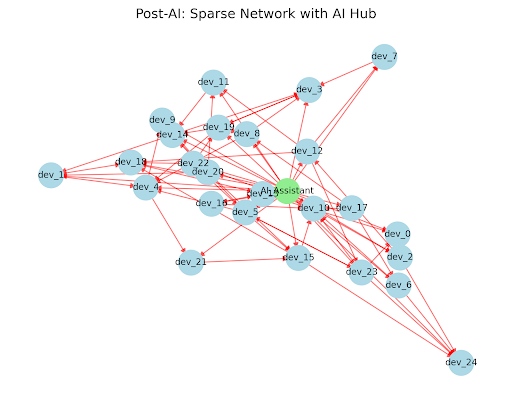 Post-AI: One "AI Assistant" node absorbs most interactions. The graph collapses into a hub-and-spoke model, with AI at the center and humans at the periphery.