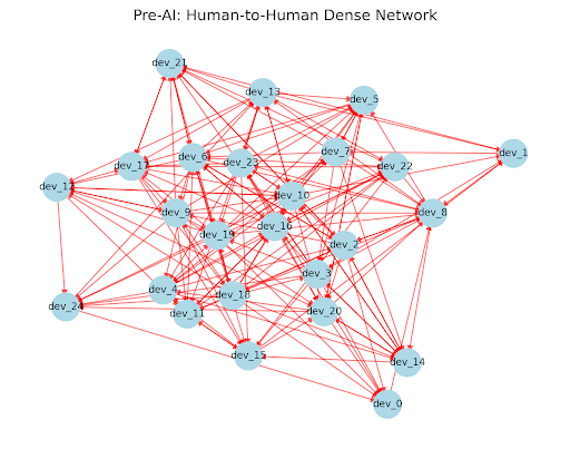 Pre-AI: A dense graph, multiple engineers at the center, resilient knowledge flow.